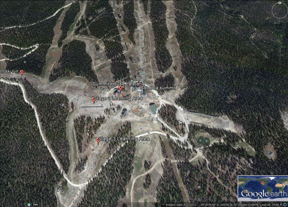 From Silverthorne or Dillon, follow east on Hwy 6 and drive about 8 miles, passing the Keystone Lodge, to East Keystone Road. There turn right into River Run Village and park in the free lot or go to River Run Road where you will turn left. On River Run Road turn right into the pay Gold Bug (also called Gondola West) Parking Lot. From either parking lot, walk to the east (right) end of the long rectangular structure that is a sort of yurt tent building. Inside find the Keystone adult ski school desk to do your paperwork. There may be a place to put on ski boots and lockers to leave shoes, etc. if you wish. There is also a rental shop in this building. When done go outside to the east. Ski school staff will indicate where the private lesson ski school meeting place is. I will be there (in a blue uniform) to meet you unless I find you sooner in the building. Once together, we will walk to the Gondola loading (there are rest rooms and drinking fountains on the way). We will board that (cabins take up to 8) with our skis and poles, which go inside with us. Assuming we need to start at the very beginning of learning to ski and the terrain available we will go up the gondola to a point about 1/3 from the bottom where there is a mainly level place to begin getting used to equipment, sliding, walking, stopping, initial turning, etc. Alternatively we may do this at the gondola top. Once this Stage 1 is accomplished we will get back on the gondola and ride to the top where there is slightly more sloping terrain for the Stage 2 of learning. Here there is a moving carpet to carry us back up after we have skied down short distances. Near this Stage 2 terrain is another set of rest rooms, possibly more lockers, a warming area, ski patrol center, drinking fountains, and a cafeteria. If a full-day lesson, we should stop for a lunch break (and others as needed) to preserve energy as there is a lot expended in the early stages of learning to ski. (The cost of lunch is not included in the lesson price; reservations may be required.) If we master Stage 2 of learning, there is another Stage 3 slope that is again a bit steeper and is served by a chairlift. Most folks on the first day do not get beyond Stage 3 (if they get to it), for the next stage is to descend the Schoolmarm ski run back to where we started the day. Because Schoolmarm is a 3.8 mile run, it is unwise to start down it without efficient technique and especially at the latter part of the day when folks can be tired and skier traffic heavy. It is usually more productive to continue practicing on the Stage 3 terrain and then ride the gondola back to our start. There are some environmental factors to consider. The weather could range from too hot to too cold, so dressing in layers with clothing that has zippers and vents helps. Sunglasses are needed if a bright day, goggles if cold or snowing. A gaiter for the neck is useful when cold. Gloves or mittens are necessary even if warm (to reduce injury chance if a fall). It is difficult to predict weather at the top of the mountain when at the bottom, and the weather can change anyway, so it is best to have options with you. Hats with ear coverings are wise. Children in childrens' lessons or private lessons are required to wear helmets when in lessons (these are available at Keystone rental shops), and the same is recommended for adults. Finally, altitude effects can occur in people, for the lift base is at 9,000 feet whereas the mountain top is at 11,640 feet; getting adequate rest before a ski day and staying hydrated and nourished are said to help reduce altitude effects and sunscreen is always needed on exposed areas of skin. These logistics are not the fun part of the day, but if we manage them, the day will be more fun. Maps of River Run Learning Areas.