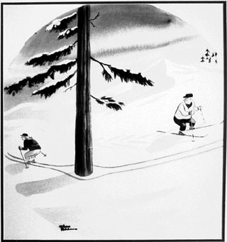 There are two obvious rules for skiing trees: Skiing among trees can provide great fun and is often where the powder is skied last. A variety of experiences can be had, for instance, taking a ride down the snow-covered length of a long log and off its lower end is an option. If the snow is softer among the trees, then adequate speed must be maintained in order to make turns of varying shape, for continual adjustment to turn radius is required and enough momentum must be present to keep the turns going. All your skills will come into play as you select, then reselect the best tactic for the moment. Often you will hear the advice to look the white spaces else your vision will draw you into the darker object you may be wanting to avoid. Many believe this to be so, but even if not completely true, try looking at the white to see if it works for you. Difficulties in skiing among trees are that spacing may vary, snow conditions may be changeable, humps may be over downed tree trunks, broken stumps or stubs may trip you, hollows may be where trees have fallen, tree wells may be around trees where the snow has melted or blown out (possibly with softer snow refilling the pocket), broken-off branches may stick out from the trees, visibility ahead will be limited. You know the old poser, "If a tree falls in the forest, does it make a sound?" If you fall alone in the forest, will you be able to make a sound loud enough to be heard, for you may not be seen. Do not ski in there alone! A final word: Eventually, after selecting the tactic to apply, you must "Point the skis down the hill; let them buck; the mountain will teach you!" Contents of "TACTICS FOR TERRAINS and SNOW