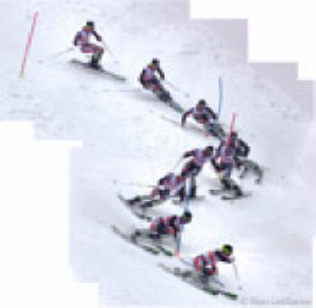 Turn phases are shown in this photo montage. Note especially the moment when the skis have gone flat to the snow and the body has reached the midpoint of crossing over them. You might note, too, how the racer's skis are at maximum tilt a bit higher in the turns than where we recreational skiers would do this--because we develop less force at our slower speeds. Neither would we ski with so much body tilting, but the images still apply to what we should do, just not so extremely. Thus the racer's legs are flexed at maximum rounding the gates and extended at maximum in between where the skis are flat to the snow. Finally, the hand position might be a bit confusing, especially at the zone where the racer is approaching the gates. This is different from what we recreational skiers do and has to do with creating a longer "float" time while the skis seek their new edges (you worked on this moment when you used patience to give the skis more time to come around the turn and reduced your tendency to quickly push the new inside ski forward). Also observe that the hands are always in front and held wide with the fist positioned so the poles stick out to the sides like whiskers; that works for us recreational types. Below are some more skiers' turns to analyze. See where the skis are flat to the snow, where they are tipped, and how the skiers have moved their torsos from one side of the skis to the other. Again, note hand-and-arm positions. Is the ski on the inside of the turn always ahead? In some cases the skiers are doing retraction turns instead of extension turns that are more common in recreational skiing and so their legs are not always longest at the crossover points. All these are from www.ronlemaster.com: exits, copyright by Ron LeMaster, used with permission. See his website for more and to order copies of his books.