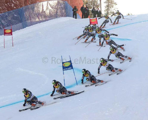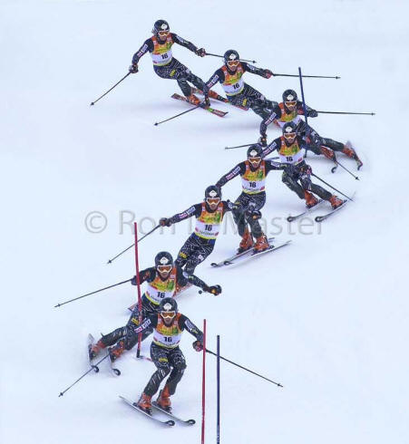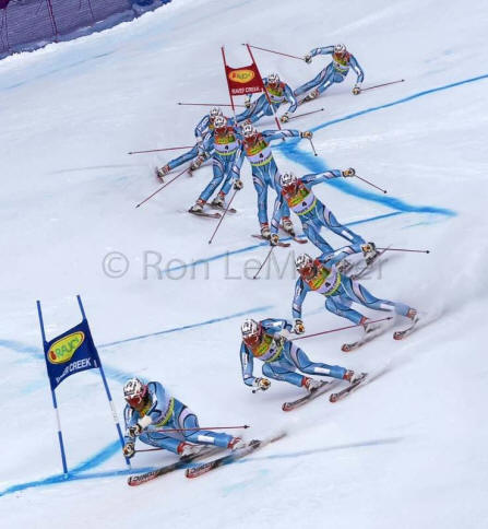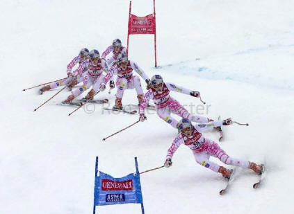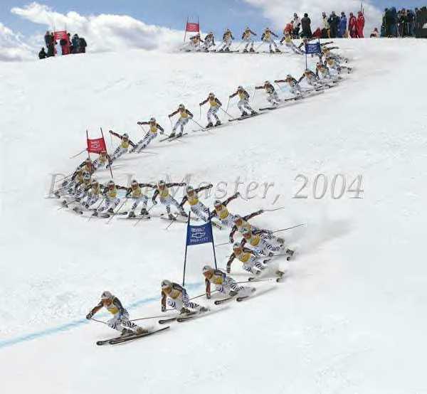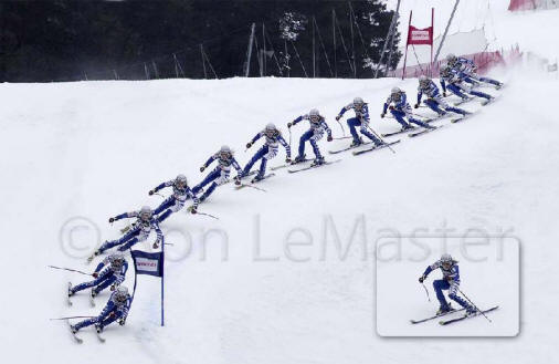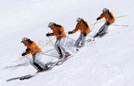Above is a single skier making a turn. Starting from the top image (which is kind of blurred, so we'll call that 1-2) , the skier behind the pole is 3 and so on down to 7. What is the skier doing? In blurred image 1 and image 2 the skier is tipped forward and bracing with the straighter downhill leg, creating braking. This will impede entry into the next turn as well as tiring the downhill leg needlessly. In image 3 the skier (behind the pole) is still somewhat braced but has softened the downill leg a bit from the prior image; the ski's bases are still visible and the skis remain tilted on their uphill sides so the new turn has not started. The skier has not changed direction between image 1-2 and image 3. By image 4 the skier has started rising but is rising straight up instead of toward the inside of the new turn. Too, the downhill leg is still straighter than the uphill leg. The downhill ski's tail is in the snow and its tip is mainly out of the snow. Because of the direction the skier chose to rise, her "aim", the downhill ski has not yet been flattened to the snow but the uphill ski has been and the skis are in a V, no longer parallel. The skier is rotating the outside of the body around the inside, using the downhill ski tail to sort of anchor the turning as in a fulcrum. Thus the outside ski will run ahead in the turn at this point (see next image 5) whereas the inside ski should be ahead here. Still, she rotates not so much as most skiers do and ends up at image 6 in a fairly good stance for power. At image 5 the skier's skis have shot forward and the skier has either moved back or has been left behind in the turn. See the position of the thighs, pointing backward and with the hips well behind the boots. The downhill ski has now gone flat to the snow but the uphill ski is already edged slightly. The inside ski has turned a lot more than the outside ski between image 4 and this one; they should have turned much the same. At image 6 the skier has nicely angled the torso against the legs but not enough to keep the pressure on the two skis the same. If the inside leg were shortened, more pressure would go to the outside leg and ski. The leg shafts are fairly parallel but still the skis are farther apart at the boots than the legs are apart at the knees, causing the skis to head in diverging direction. At image 7 the skier has lost the angulation started in image 6 and is in sort of a bracking position to manage the forces developing at the end of the turn. Depending on those forces and her strength she might be better off having her shoulders tilted parallel to the slope instead of as they are. It's hard to tell if she has more weight on her heels here, depending on the turn's forces, but her outside ski has bent, tending her to turn uphill but perhaps more than she wants at this point. At image 8 (if there was one), the skier would hopefully have already started shortening the downhill leg to get into the new turn soon. Solution to create a gliding turn: Shorten the downhill leg at image 1 and 2 and then keep it short until image 7 when the new downhill leg will be shortened to start the next turn. Simple to say. Is skiing with efficient technique complicated? Not really. It's just hard to do. But then why did not the skier move in a way that would have been more effective? Prior to images 1 and 2 she had picked up speed having just been in a phase in the prior turn when she was pointed downhill, accelerating. Perhaps not wanting to carry that extra speed into the next turn, she braced to skid the skis and cause friction to slow her up, bracing with that stiff downhill leg that however kept her from entering the next turn cleanly and in a way she could have had the skis turn in a wider arc (which would have slowed her, too) than she got with her method. That wider arc likely would have kept her skis going at the same speed and not accelerating, smoothing out the forces on her and making them easier to manage. The root cause of this technique may therefore be apprehension, or fear. Such fear may have become implanted by getting onto slopes that gave too much acceleration to her turns prior to her learning the technique to better cope with acceleration and learn how to manage it. Compare the skier's hand and arm position with the ones of racers in the photos seen earlier on this page. Note how her hands are lower and not out to the side as much, thus compromising her ability to balance and also reducing tension on her core muscles she might otherwise have had, as the racers have done. But her stance overall puts her body in a position in which she could alter he movement patterns slightly and make her skiing more efficient. But her hands/arms positions are much better than that of most skiers. She is not a bad skier, as the terrain looks a bit challenging, doesn't it? But could she do better without too much time and effort? Likely. And if that pole in the picture is part of a race course she might win the race or win it better. "How many psychologists (or ski instructors) does it take
