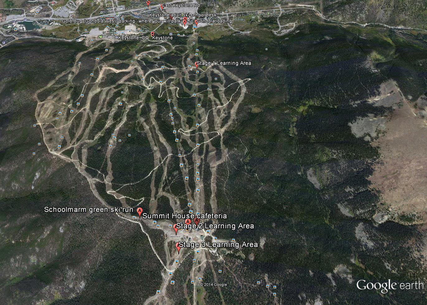 From Silverthorne or Dillon, follow east on Hwy 6 and drive about 8 miles, passing the Keystone Lodge, to East Keystone Road. There turn right into River Run Village and park in the free lot or go to River Run Road where you will turn left. On River Run Road turn right into the pay Gold Bug (also called Gondola West) Parking Lot. From either parking lot, walk to the east (right) end of the long rectangular structure that is a sort of yurt tent building. Inside find the Keystone adult ski school desk to do your paperwork. There may be a place to put on ski boots and lockers to leave shoes, etc. if you wish. There is also a rental shop in this building. When done go outside to the east. Ski school staff will indicate where the private lesson ski school meeting place is. I will be there (in a blue uniform) to meet you unless I find you sooner in the building. Once together, we will walk to the Gondola loading (there are rest rooms and drinking fountains on the way). We will board that (cabins take up to 8) with our skis and poles, which go inside with us. Assuming we need to start at the very beginning of learning to ski and the terrain available we will go up the gondola to a point about 1/3 from the bottom where there is a mainly level place to begin getting used to equipment, sliding, walking, stopping, initial turning, etc. Alternatively we may do this at the gondola top. Once this Stage 1 is accomplished we will get back on the gondola and ride to the top where there is slightly more sloping terrain for the Stage 2 of learning. Here there is a moving carpet to carry us back up after we have skied down short distances. Near this Stage 2 terrain is another set of rest rooms, possibly more lockers, a warming area, ski patrol center, drinking fountains, and a cafeteria. If a full-day lesson, we should stop for a lunch break (and others as needed) to preserve energy as there is a lot expended in the early stages of learning to ski. (The cost of lunch is not included in the lesson price; reservations may be required.) If we master Stage 2 of learning, there is another Stage 3 slope that is again a bit steeper and is served by a chairlift. Most folks on the first day do not get beyond Stage 3 (if they get to it), for the next stage is to descend the Schoolmarm ski run back to where we started the day. Because Schoolmarm is a 3.8 mile run, it is unwise to start down it without efficient technique and especially at the latter part of the day when folks can be tired and skier traffic heavy. It is usually more productive to continue practicing on the Stage 3 terrain and then ride the gondola back to our start. There are some environmental factors to consider. The weather could range from too hot to too cold, so dressing in layers with clothing that has zippers and vents helps. Sunglasses are needed if a bright day, goggles if cold or snowing. A gaiter for the neck is useful when cold. Gloves or mittens are necessary even if warm (to reduce injury chance if a fall). It is difficult to predict weather at the top of the mountain when at the bottom, and the weather can change anyway, so it is best to have options with you. Hats with ear coverings are wise. Children in childrens' lessons or private lessons are required to wear helmets when in lessons (these are available at Keystone rental shops), and the same is recommended for adults. Finally, altitude effects can occur in people, for the lift base is at 9,000 feet whereas the mountain top is at 11,640 feet; getting adequate rest before a ski day and staying hydrated and nourished are said to help reduce altitude effects and sunscreen is always needed on exposed areas of skin. These logistics are not the fun part of the day, but if we manage them, the day will be more fun. Maps of River Run Learning Areas.