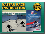 well. Why did it fly well? Because I threw it the right way." Gates are thin poles or squat stubs set on ski slopes through which skiers pass (if set in pairs) or turn around (if set singly) They are used to produce standard routes or courses for skiers to practice consistent turns, isolating some of the variables of a ski slope. "Turn here, Now!" the gate requires, a discipline that is important for skiers to acquire rather than shopping the slope for a better place to turn, which may not be found and at least will interrupt the rhythm of the skiing. Of course, gates are also used for racing, with elapsed times down the course being recorded and compared for the racers. Skiers should be at level 6 (parallel skiing) to fully enjoy running gates or racing, but they can start at almost any skill level if the gates are set for that level. Gates are set down a ski hill in various configurations to produce different kinds of turns and challenges. Sometimes they are closely spaced; other times far apart so that it is not readily apparent that they describe a linked set. In either case, gates are set by a trained person so the desired skier turns are required. And as each skier passes down the course, the track is grooved into a developing rut. The more skiers, the deeper and rougher the rut becomes. Thus the course is not available to those who are not part of the invited group. If in doubt about an invitation, find the course setter and ask whether the course may be run. Persons running gates are focused on their task and to do it well they cannot be distracted by slope traffic. Often the ski hill where the gates are placed is closed to the public, with signs stating that. To ski into such an area, or even near a course that is not closed off, risks a collision with a racer or training skier who does not expect you to be there. And, one never crosses the line of a ski course without at least first checking upslope to be sure the path is clear, and sometimes it is necessary to ask permission to cross and then wait until it is granted, if it can be.. "O.K., so running gates is good for skiing. But why race through them?", many skiers ask. They demur they are not competitive. Many of those who so state do not know themselves well. It often happens that once a skier runs a course and gets a timed result, the fires light and the course is run again and again, with requests for coaching to run it faster and beat ...(whomever). Many ski areas provide posted areas where gates can be run and times obtained, often for a fee. Many ski areas provide courses set daily with automatic timers. Usually there is a small charge by the resort to run these, but some allow ski school patrons to race free.