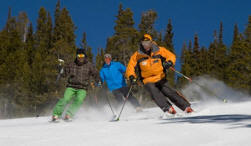Objectives of skiing in a balanced stance are two-fold: 1) You will have more options to move into slightly out-of-balance positions to cause the skis to perform as you wish in special situations, and 2) because you will be able to use the skis more to cause your turns rather than your muscles, you will have more strength to effect the most efficient movements, and you will also be able to ski more hours in the day, more days in the ski vacation, more weeks in the ski year, and more years in the ski lifetime. Muscle tone and practice are where balance come from. Body mechanisms such as inner ear devices may also play a role, but we pretty much have to use what we already possess within that area. Skiers can exercise off the slopes to tone muscles. They can do daily chores like putting on socks while standing on one foot. Or they can walk a rail or stand on one foot on the top of a short post. There are also balance boards which consist of a slotted drum and a board with a rail that slides along the slot as the drum rolls and the skier stands atop the board. To learn balance on skis while on a slope, however, will probably require some special exercises and a degree of "I can do it" commitment. Humans have a natural tendency to seek the vertical position. But to be balanced against the forces of a ski turn, a skier often must be oriented off the vertical. Many skiers must be coached and coaxed into this new feeling. One simple tip, however, is to keep the eyes up so that landscape elements (trees, horizons, posts) give references to where horizontal and vertical lie. Looking up also helps you see where you are going and gives you more time to plan your course and reactions. (One instructor asked for a bottle of wine every time a student looked down, and was owed probably a freight-car load by winter's end, although he didn't collect any.) Lightly touching or dragging a ski pole along the snow surface, like an antenna, can also give a feel for slope angles and one's positioning. Of course, skiers wishing to improve balance should not push beyond the upper limit of their comfort or reality zones. That is usually counter-productive and results in substitution of moves that presently seem more comfortable than the ones that need to be learned. Instead, pick slopes that are not so steep as to inhibit making the needed moves. Then practice on similar terrain until ready to try the next degree. Eventually on really steep slopes, the needed move seems like a dive down the hill to get into the balanced position. In fact, one is surely out of balance while making some moves, for it is necessary to apply new forces to skis than the ones that keep everything centered--else the skis won't do anything new. One student called the turn so effected a religious turn; "It takes faith," he said, "to move into the scary position so the skis will turn. But it works!" (See more on this "out-of-balance" move on the page "How Skis Work..." and go down to the section "Should we ever be out of balance?") Way to feel the position of leaning into a turn: