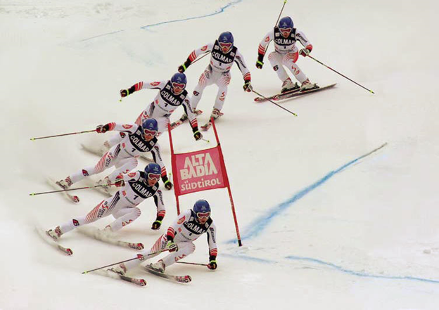 Few or none of these skiers are aligned perpendicular to the ski slope although to their credit they are tipped a bit forward from vertical. All have their hands down at their sides; some have their hands toward the back. Thus, they are not balanced over the length of their feet or their skis. To get in balance, they need to bring their hands up to waist height and forward with their elbows in front of the hips. Having the hands apart 2 to 3 feet when in the up and forward position will allow them to be better balanced side-to-side and make adjustments by moving a hand in or out or up or down as needed. Simple? Then why do most skiers ski like the folks in the picture?