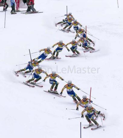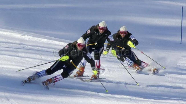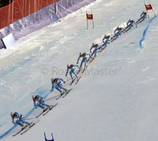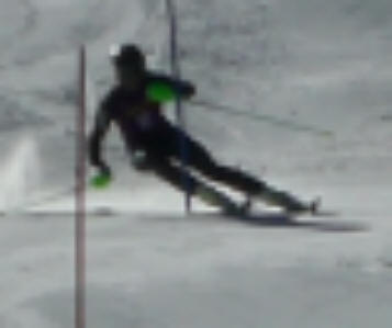 Above is a single skier making a turn. Starting from the top image (which is kind of blurred, so we'll call that 1-2) , the skier behind the pole is 3 and so on down to 7. What is the skier doing? In blurred image 1 and image 2 the skier is tipped forward and bracing with the straighter downhill leg, creating braking. This will impede entry into the next turn as well as tiring the downhill leg needlessly. In image 3 the skier (behind the pole) is still somewhat braced but has softened the downill leg a bit from the prior image; the ski's bases are still visible and the skis remain tilted on their uphill sides so the new turn has not started. The skier has not changed direction between image 1-2 and image 3. By image 4 the skier has started rising but is rising straight up instead of toward the inside of the new turn. Too, the downhill leg is still straighter than the uphill leg. The downhill ski's tail is in the snow and its tip is mainly out of the snow. Because of the direction the skier chose to rise, her "aim", the downhill ski has not yet been flattened to the snow but the uphill ski has been and the skis are in a V, no longer parallel. The skier is rotating the outside of the body around the inside, using the downhill ski tail to sort of anchor the turning as in a fulcrum. Thus the outside ski will run ahead in the turn at this point (see next image 5) whereas the inside ski should be ahead here. Still, she rotates not so much as most skiers do and ends up at image 6 in a fairly good stance for power. At image 5 the skier's skis have shot forward and the skier has either moved back or has been left behind in the turn. See the position of the thighs, pointing backward and with the hips well behind the boots. The downhill ski has now gone flat to the snow but the uphill ski is already edged slightly. The inside ski has turned a lot more than the outside ski between image 4 and this one; they should have turned much the same. At image 6 the skier has nicely angled the torso against the legs but not enough to keep the pressure on the two skis the same. If the inside leg were shortened, more pressure would go to the outside leg and ski. The leg shafts are fairly parallel but still the skis are farther apart at the boots than the legs are apart at the knees, causing the skis to head in diverging direction. At image 7 the skier has lost the angulation started in image 6 and is in sort of a bracking position to manage the forces developing at the end of the turn. Depending on those forces and her strength she might be better off having her shoulders tilted parallel to the slope instead of as they are. It's hard to tell if she has more weight on her heels here, depending on the turn's forces, but her outside ski has bent, tending her to turn uphill but perhaps more than she wants at this point. At image 8 (if there was one), the skier would hopefully have already started shortening the downhill leg to get into the new turn soon. Solution to create a gliding turn: Shorten the downhill leg at image 1 and 2 and then keep it short until image 7 when the new downhill leg will be shortened to start the next turn. Simple to say. Is skiing with efficient technique complicated? Not really. It's just hard to do. But then why did not the skier move in a way that would have been more effective? Prior to images 1 and 2 she had picked up speed having just been in a phase in the prior turn when she was pointed downhill, accelerating. Perhaps not wanting to carry that extra speed into the next turn, she braced to skid the skis and cause friction to slow her up, bracing with that stiff downhill leg that however kept her from entering the next turn cleanly and in a way she could have had the skis turn in a wider arc (which would have slowed her, too) than she got with her method. That wider arc likely would have kept her skis going at the same speed and not accelerating, smoothing out the forces on her and making them easier to manage. The root cause of this technique may therefore be apprehension, or fear. Such fear may have become implanted by getting onto slopes that gave too much acceleration to her turns prior to her learning the technique to better cope with acceleration and learn how to manage it. Compare the skier's hand and arm position with the ones of racers in the photos seen earlier on this page. Note how her hands are lower and not out to the side as much, thus compromising her ability to balance and also reducing tension on her core muscles she might otherwise have had, as the racers have done. But her stance overall puts her body in a position in which she could alter he movement patterns slightly and make her skiing more efficient. But her hands/arms positions are much better than that of most skiers. She is not a bad skier, as the terrain looks a bit challenging, doesn't it? But could she do better without too much time and effort? Likely. And if that pole in the picture is part of a race course she might win the race or win it better. "How many psychologists (or ski instructors) does it take