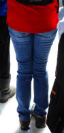 physics of skiing. Women carry proportionally more weight in their th Ever notice how the heads of men and women are often close to the same height when mixed genders are seated (because their torsos are about the same length), but how that changes when they stand? Also, see how the knee-height of all persons in this photo is about the same; the thigh-bone lengths differ markedly, however, and all the men have much longer thigh-bones than the women. (The women, shorter,are 2nd and 4th from the left. The man who is third from left has both long lower legs and long thighs) Note, too, that the women have wider hips and closer knees. This picture is perhaps dated as younger women are taller today and seem to have longer thigh-bones. There are many variations and they affect how we ski. Women are generally shorter in height and lighter in weight than men. One source--presumably of anglo-saxons--shows that the average mature woman is about 135 pounds and 5' 3" tall; the average mature man is 165 pounds and 5' 7" tall. (In recent time, younger American women seem to be becoming taller as they mature, perhaps even more so than are younger American men.) Of course there are many variations. Because women are on average lighter and smaller than men, women generally need skis that are shorter and softer lengthwise so they can bend them as much as men can bend the models they need. If the average woman skis slower than the average man, the smaller forces she develops would also indicate the same need in ski design. For years, maybe even a century, ski gear was designed by men but to be used by all. Today, softer and shorter women's skis are available. The same is true for boots, with an added factor, discussed next.
